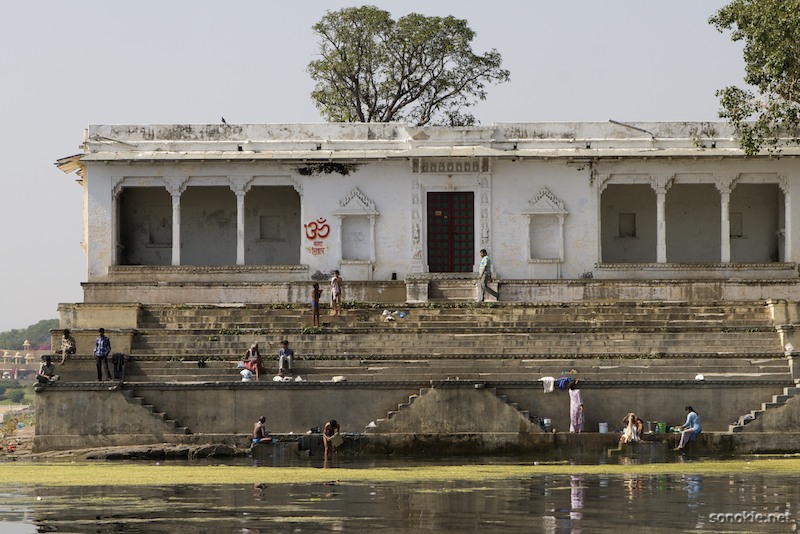 People bathing, washing and resting at a ghat in Udaipur across the water from City Palace.